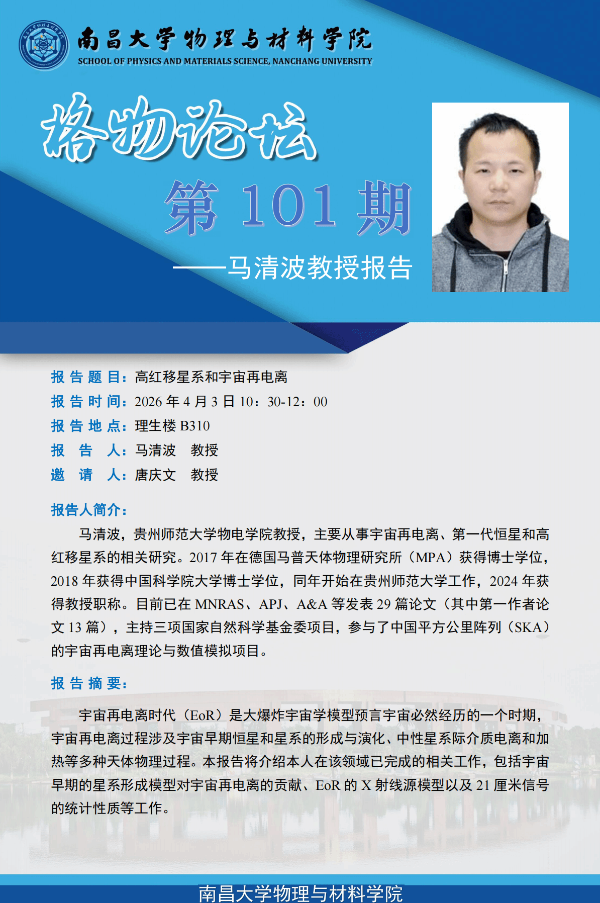 物理与材料学院格物论坛第101期-马清波教授《高红移星系和宇宙再电离》