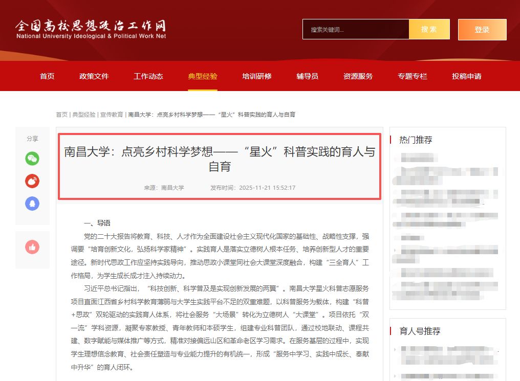 2025-11-22全国高校思想政治工作网刊发我院星火科普实践育人案例编辑按:11月21日,全国高校思想政治工作网刊发我院星火科普实践育人案例,报道我院推动思政小课堂同社会大课堂深度融合,构建“三全育人”工作格局,为学生成长成才注入持续动力。详细如下:
