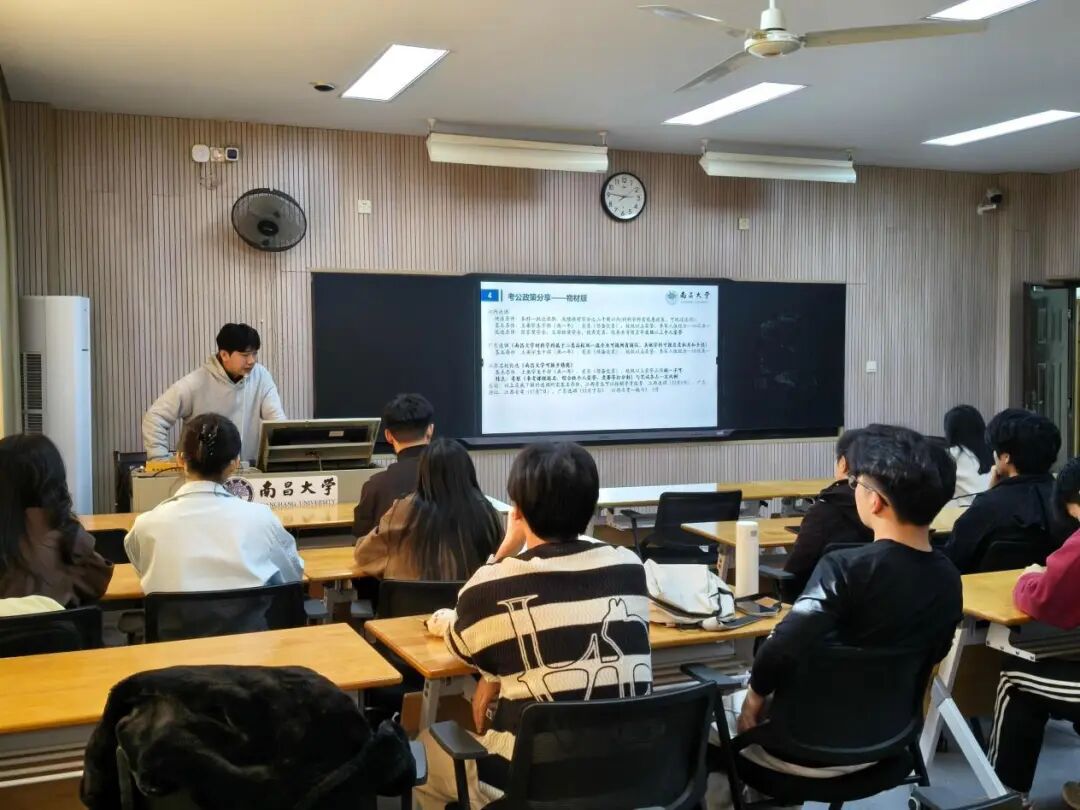 Recently, the 224th session of the "Nanxiaoyan" micro-lecture hall of the 16th "Qianhu Research Lecture" Graduate Academic and Cultural Festival, sponsored by the Graduate Work Department of the Party Committee of Nanchang University and the University Graduate Student Union, and co-organized by colleges and their respective graduate student unions, was successfully held in Room 201 of the Graduate School. This "Nanxiaoyan" micro-lecture hall specially invited Yang Wenjun, a master's degree candidate from our college in 2023, to give a special lecture titled "Growth on the Research Path: Experiences and Reflections on Scientific Research, Competitions, and Civil Service Examination" to all graduate students of our college.