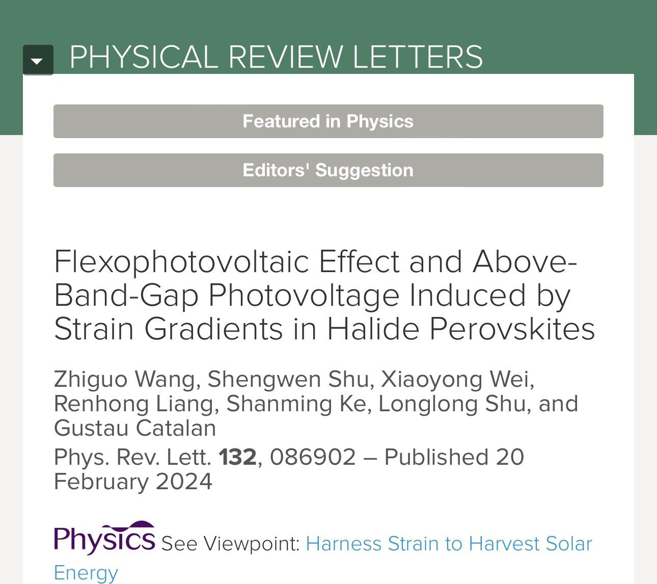 The paper was selected as an Editors' Suggestion article for the current issue (PRL selects no more than 15% of the best articles to be selected as Editors' Suggestions), and also received a Viewpoint feature on the official website of APS Physics, the official website of the American Physical Society (the Viewpoint section represents the highest form of recommendation for the journal). Zhiguo Wang, a full-time postdoctoral fellow at the School of Physics and Materials, is the first author of the paper, and his co-supervisor, Prof. Longlong Shu, is the corresponding author of the paper; Prof. Gustau Catalan of the Instituto Superior de Estudios de Catalunya (ISEC), Spain, is the co-corresponding author of the paper, and Nanchang University is the first and corresponding author of the paper.