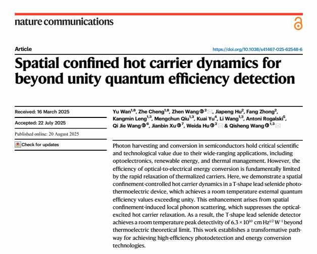 Recently, the research team on photodetection materials has proposed a new mechanism for room-temperature infrared photodetection, namely the "space-confined enhanced photothermal carrier effect," for the first time internationally. Based on this mechanism, the team has successfully developed a prototype device of a 32×32 lead selenide mid-wave infrared focal plane array that operates at room temperature. The greatest advantage of this device lies in its no need for cooling, high sensitivity, and extremely low power consumption, paving a new way for the development of lightweight, low-cost, and high-performance infrared imaging systems. The relevant research results have been published in Nature Communications (2025) 16:7756, a top international comprehensive journal.