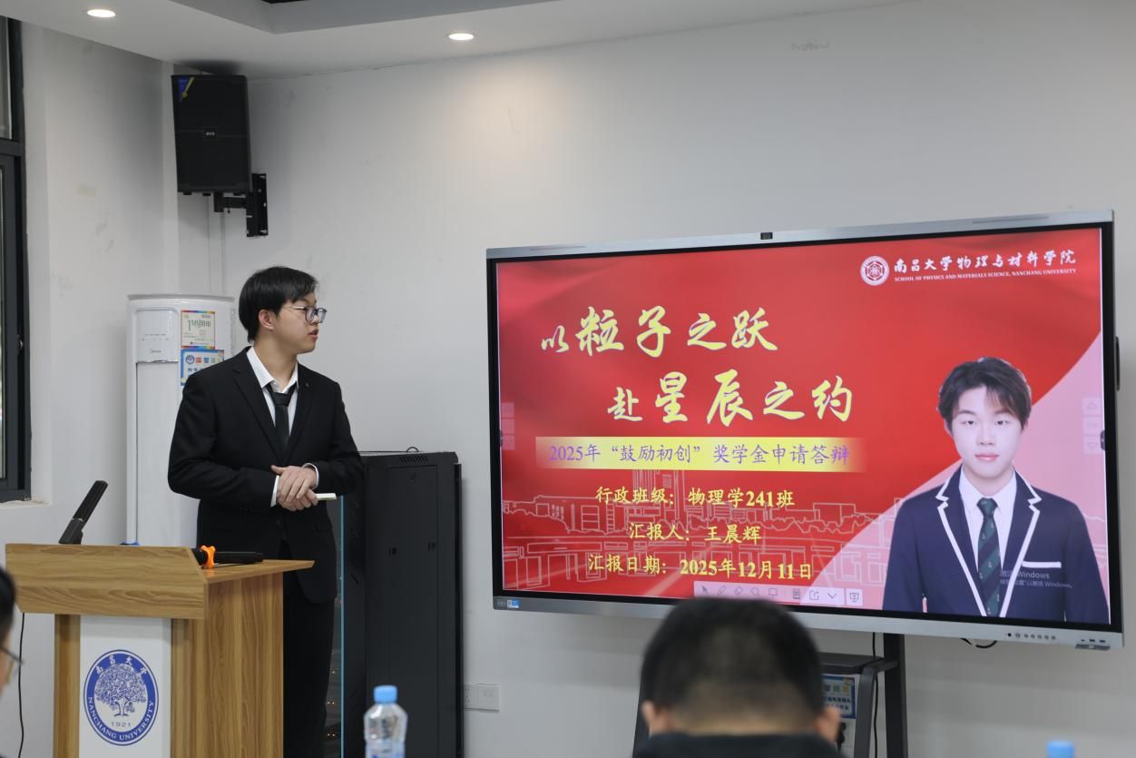 为激发学子创新潜能,培育初创实践能力,由校友匡平华捐赠设立的南昌大学物理与材料学院2024-2025学年鼓励初创奖学金答辩会,于12月11日在 24 栋启智堂顺利举行。本次答辩会特邀校友工作办公室主持工作副主任王军花、学院副院长周杨波老师、物理系系主任赵勇老师、材料科学与工程系副系主任饶郑刚老师担任评委。