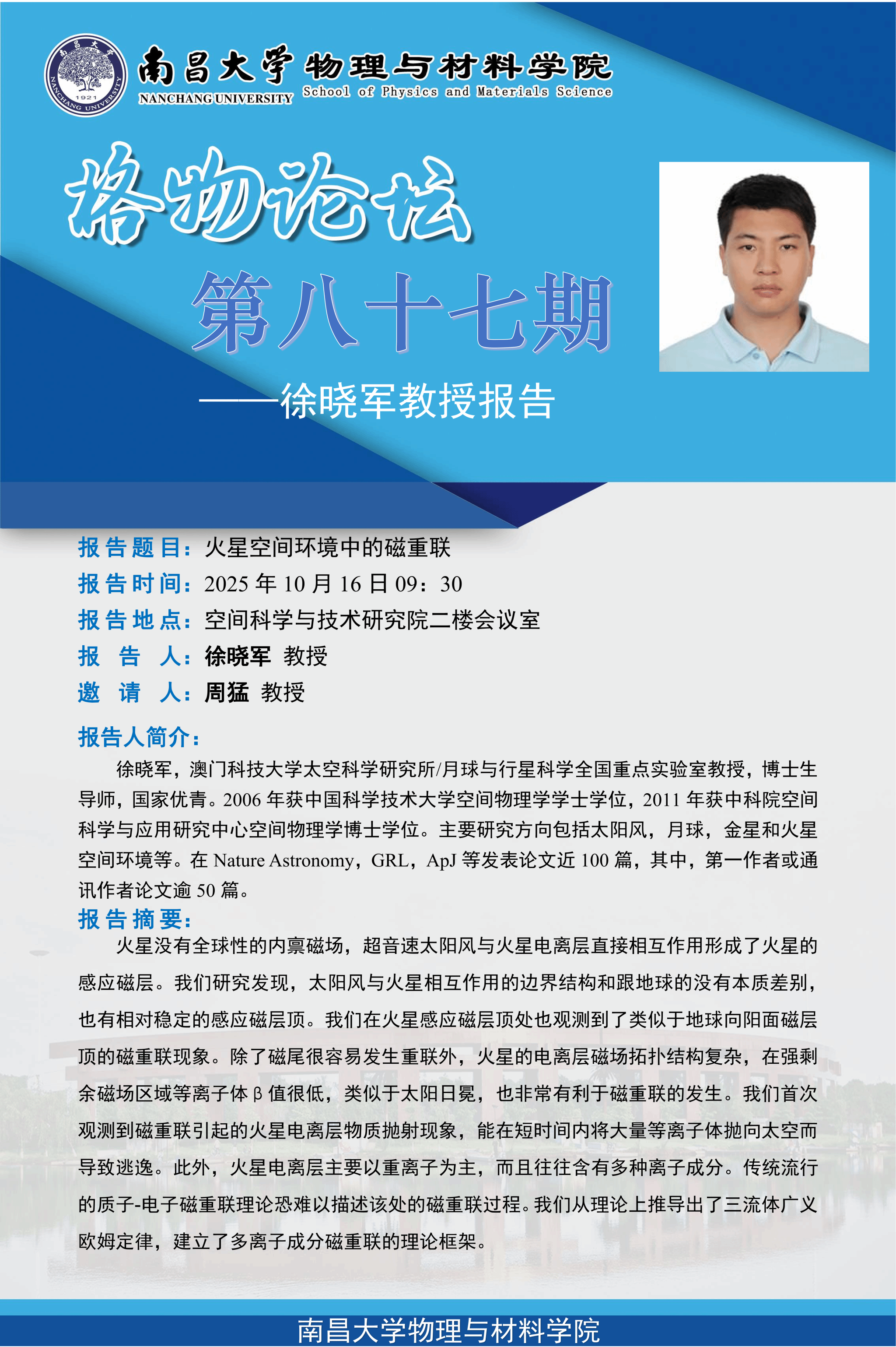 物理与材料学院格物论坛第八十七期--徐晓军教授《火星空间环境中的磁重联》